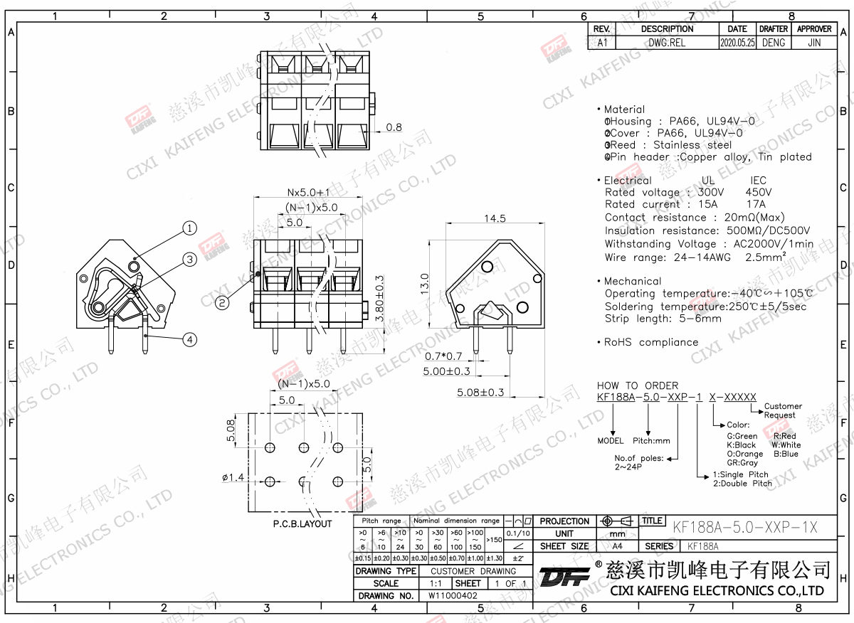 Terminal Material:①Button:PA66,UL94V-0②Cover:PA66,UL94V-0③Reed:Stainless steel④Pin header:Brass,Tin platedElectricalULIECRated voltage300V 450VRated current15A17AContact resistance20mΩInsulation resistance500MΩ/DC500VWithstanding voltage AC2000V/1minWire range24-14AWG 2.5mm2MechanlicalTemp.rang-40℃~+105℃ Max.soldering+250℃,5secTorque