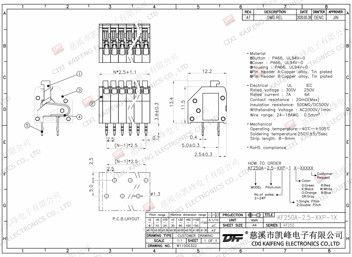 Material:①Button:PA66,UL94V-0②Cover:PA66,UL94V-0③Button:PA66,UL94V-0④Pin headerA:Brass,Tin plated⑤Pin headerB:Brass,Tin platedElectricalULIECRated voltage300V 250V Rated current7A6AContact resistance20mΩInsulation resistance500MΩ/DC500VWithstanding voltage AC2000V/1minWire range24-18AWG 0.5mm2MechanlicalTemp.rang-40℃~+105℃