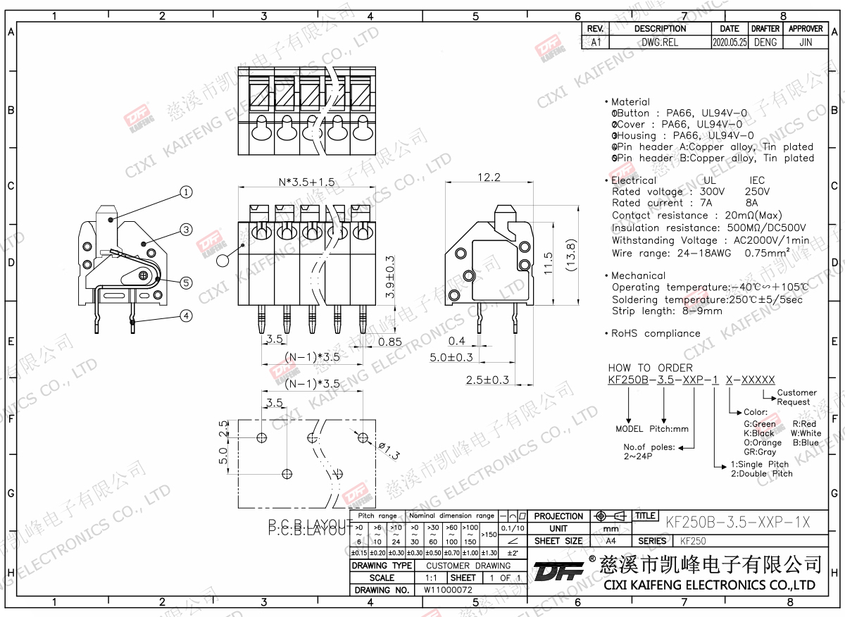 Terminal Material:①Button:PA66,UL94V-0②Cover:PA66,UL94V-0③Button:PA66,UL94V-0④Pin headerA:Brass,Tin plated⑤Pin headerB:Brass,Tin platedElectricalULIECRated voltage300V 450V Rated current7A9AContact resistance20mΩInsulation resistance500MΩ/DC500VWithstanding voltage AC2000V/1minWire range24-18AWG 0.75mm2MechanlicalTemp.rang-40℃~+105℃