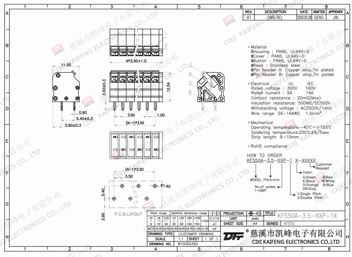 Terminal Material:①Housing:PA66,UL94V-0②Cover:PA66,UL94V-0③Cover:PA66,UL94V-0④Button:PA66,UL94V-0⑤Reed:Stainless steel⑥Long welding leg:Red copper,Tin plated⑦Short welding leg:Red copper,Tin platedElectricalULIECRated voltage300V 320V Rated current10A17.5AContact resistance20mΩInsulation resistance500MΩ/DC500VWithstanding voltage AC2000V/1minWire range26-16AWG 1.5mm2