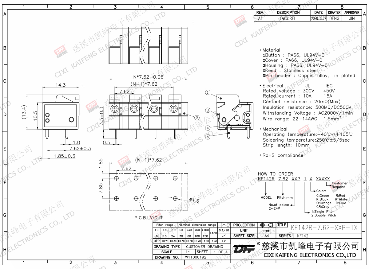 Material:①Button:PA66,UL94V-0②Cover:PA66,UL94V-0③Button:PA66,UL94V-0④Reed:Stainless steel⑤Pin header:Brass,Tin platedElectricalULIECRated voltage300V 250V Rated current10A15AContact resistance20mΩInsulation resistance500MΩ/DC500VWithstanding voltage AC2000V/1minWire range22-14AWG 1.5mm2MechanlicalTemp.rang-40℃~+105℃ Max.soldering+250℃,5sec