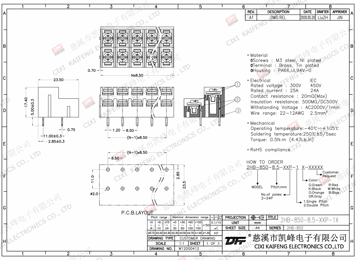Material:PA66UL94V-0Terminal:Brass,0.7Tin platedScrews:Steel,M3Ni platedElectricalRated voltage/Rated current:300V/20ATemp.rang:-40℃~+105℃Withstanding voltage :AC2000V/MinInsulation resistance:500MΩ/DC500VWire range:22~12AWGTorque:0.5N.m4.4Lb.in