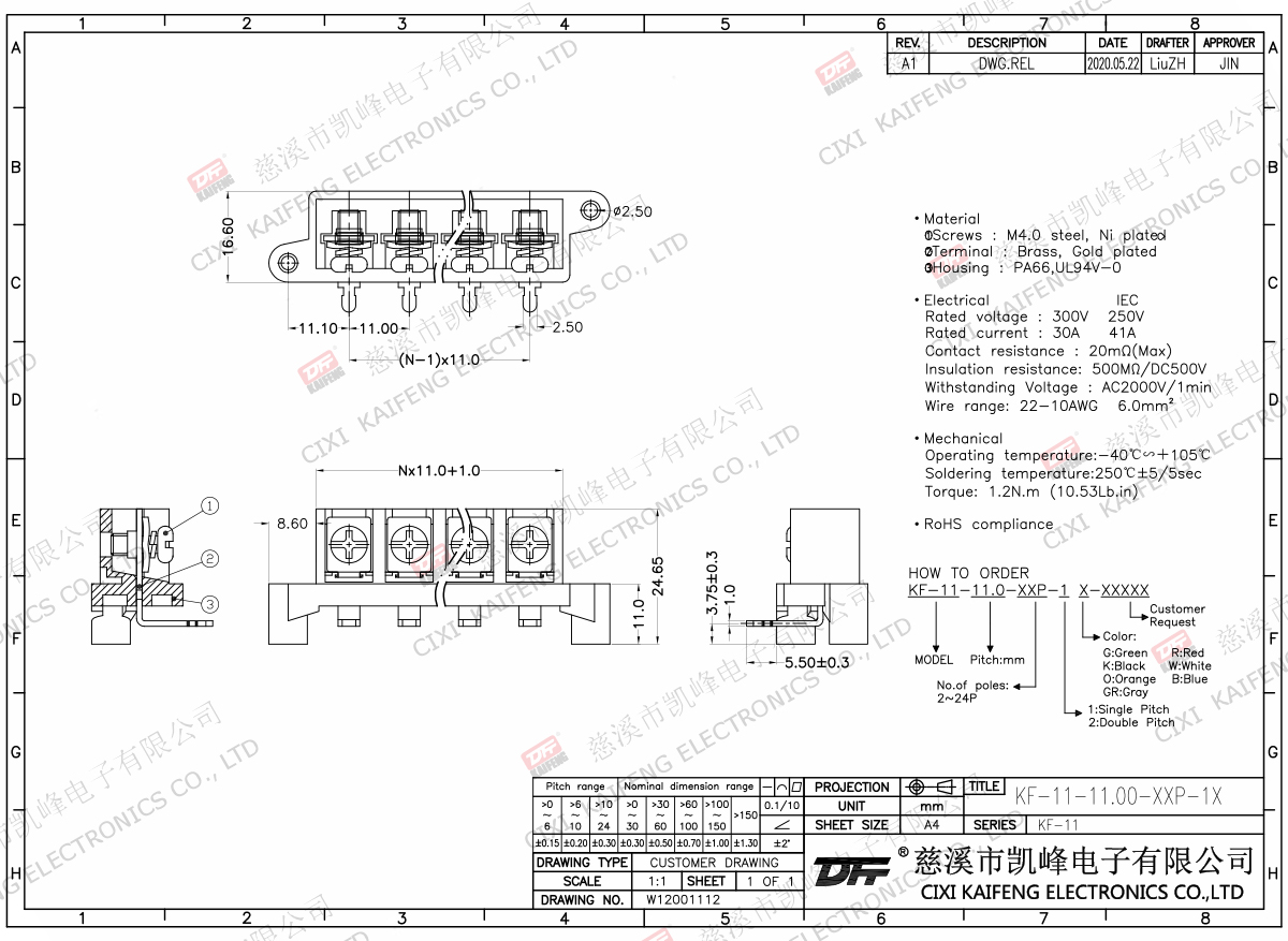 Material:M4.0 Steel,Ni platedTerminal:Brass,1.0t Ni platedHousing: PA66,UL94V-0ElectricalULIECRated voltage300V 250V Rated current30A41AInsulation resistance500MΩ/DC500VWithstanding voltage AC2000V/1minWire range22-10AWG 6.0mm2MechanlicalTemp.rang-40℃~+105℃ Torque1.2N.m 10.53Lb.in