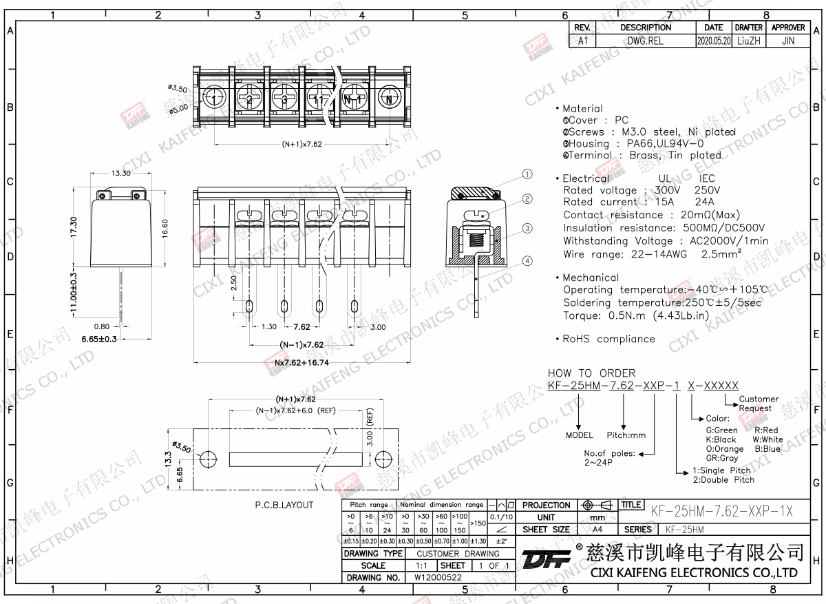 Material:M3.0 Steel,Ni platedTerminal:Brass,0.8t Ni platedHousing: PA66,UL94V-0ElectricalULIECRated voltage300V 250V Rated current15A24AInsulation resistance500MΩ/DC500VWithstanding voltage AC2000V/1minWire range22-14AWG 2.5mm2MechanlicalTemp.rang-40℃~+105℃ Torque0.5N.m 4.4Lb.in