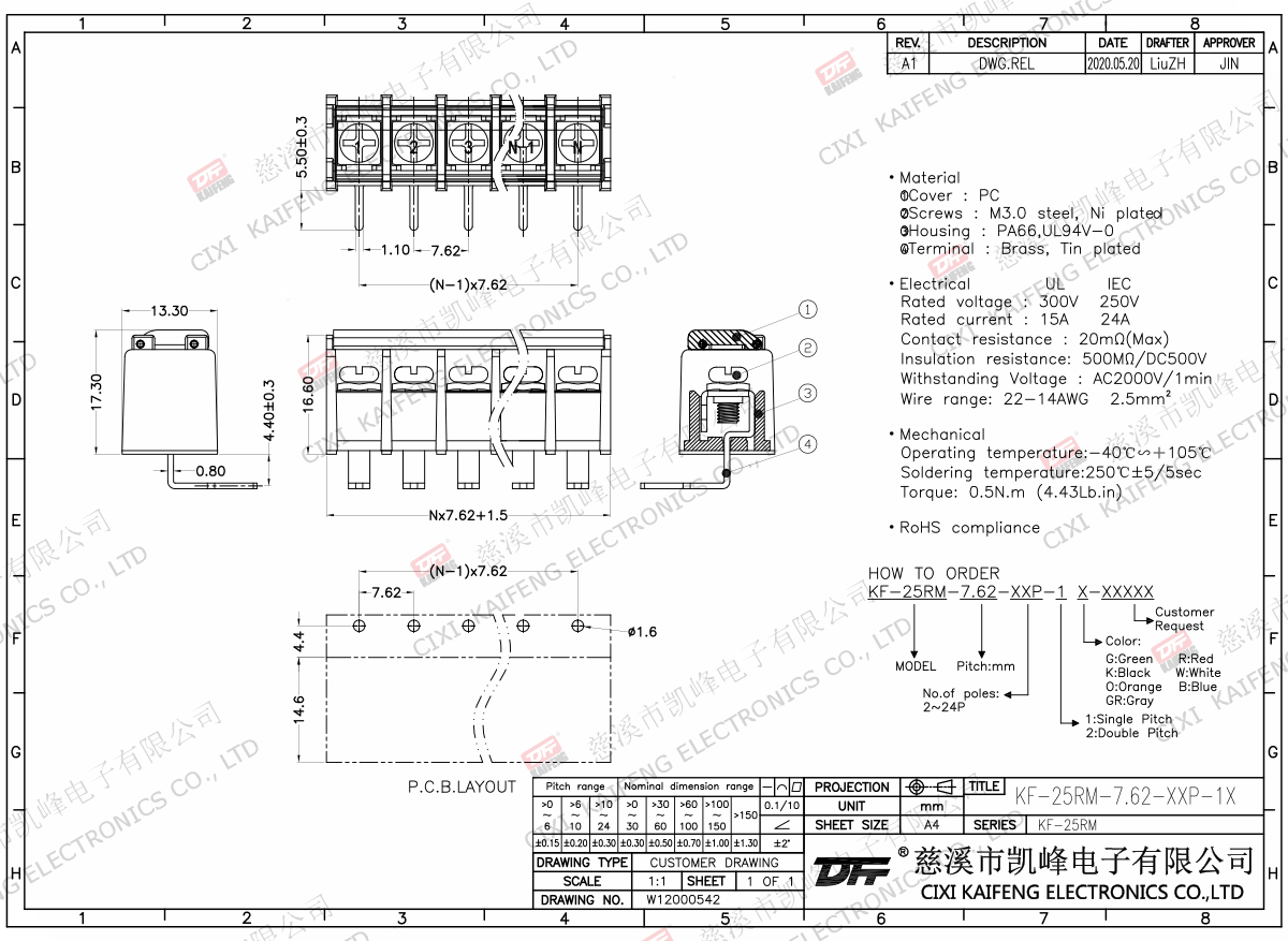 Material:M3.0 Steel,Ni platedTerminal:Brass,0.8t Ni platedHousing: PA66,UL94V-0ElectricalULIECRated voltage300V 250V Rated current15A24AInsulation resistance500MΩ/DC500VWithstanding voltage AC2000V/1minWire range22-14AWG 2.5mm2MechanlicalTemp.rang-40℃~+105℃ Torque0.5N.m 4.4Lb.in