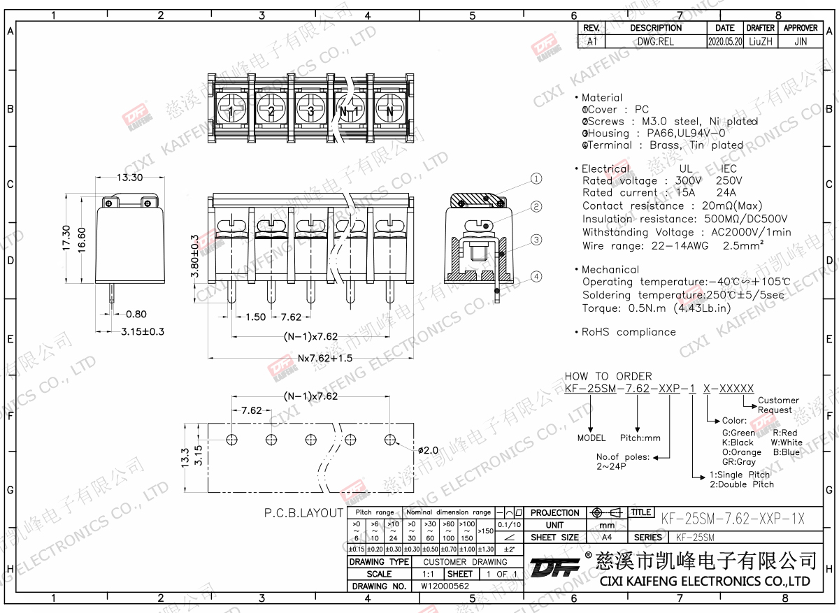 Material:M3.0 Steel,Ni platedTerminal:Brass,0.8t Ni platedHousing: PA66,UL94V-0ElectricalULIECRated voltage300V 250V Rated current15A24AInsulation resistance500MΩ/DC500VWithstanding voltage AC2000V/1minWire range22-14AWG 2.5mm2MechanlicalTemp.rang-40℃~+105℃ Torque0.5N.m 4.4Lb.in