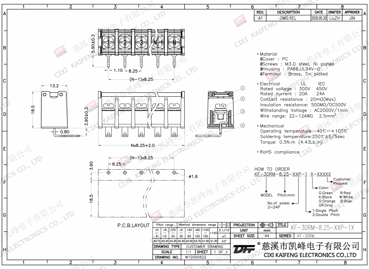 Material:M3.0 Steel,Ni platedTerminal:Brass,0.8t Ni platedHousing: PA66,UL94V-0ElectricalULIECRated voltage300V 450V Rated current20A24AInsulation resistance500MΩ/DC500VWithstanding voltage AC2000V/1minWire range22-12AWG 2.5mm2MechanlicalTemp.rang-40℃~+105℃ Torque0.5N.m 4.4Lb.in