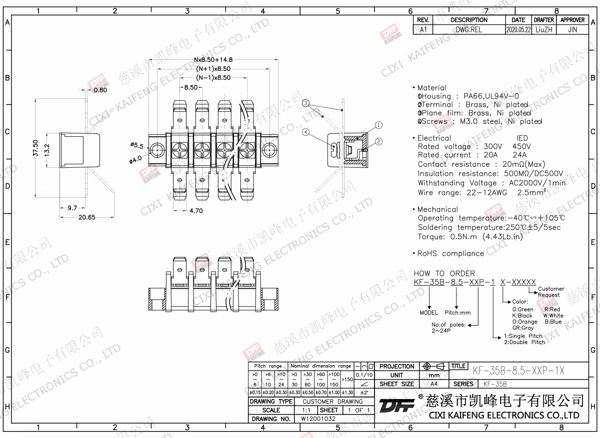 Material:M3.0 Steel,Ni platedTerminal:Brass,0.8t Ni platedHousing: PA66,UL94V-0ElectricalULIECRated voltage300V 450V Rated current20A24AInsulation resistance500MΩ/DC500VWithstanding voltage AC2000V/1minWire range22-12AWG 2.5mm2MechanlicalTemp.rang-40℃~+105℃ Torque0.5N.m 4.4Lb.in