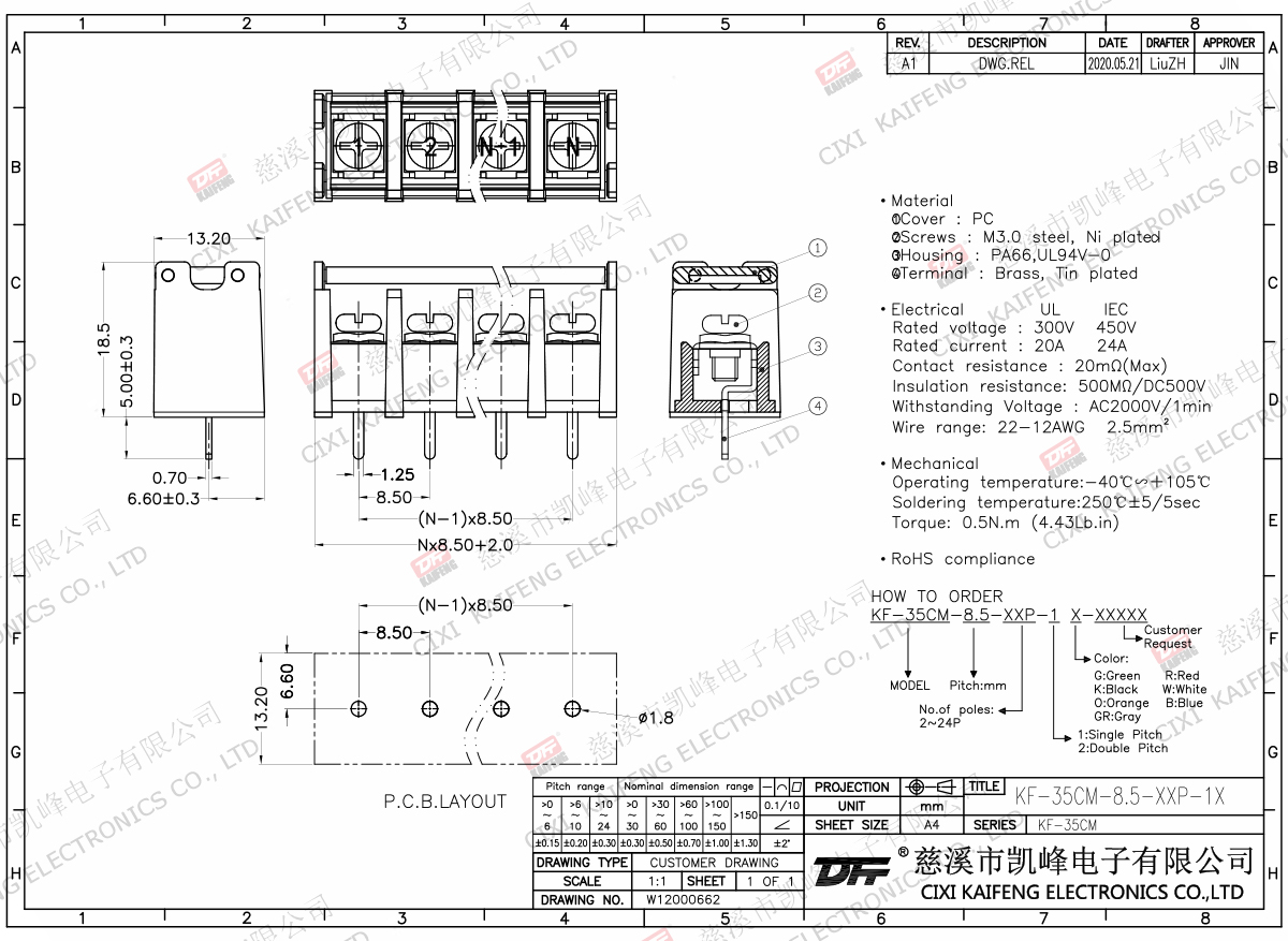 Material:M3.0 Steel,Ni platedTerminal:Brass,0.7t Ni platedHousing: PA66,UL94V-0ElectricalULIECRated voltage300V 450V Rated current20A24AInsulation resistance500MΩ/DC500VWithstanding voltage AC2000V/1minWire range22-12AWG 2.5mm2MechanlicalTemp.rang-40℃~+105℃ Torque0.5N.m 4.4Lb.in