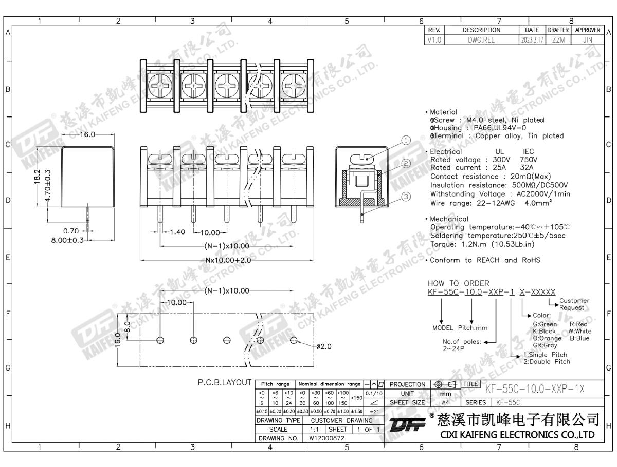 Material:M4.0 Steel,Ni platedTerminal:Brass,0.8t Ni platedHousing: PA66,UL94V-0ElectricalULIECRated voltage300V 750V Rated current25A32AInsulation resistance500MΩ/DC500VWithstanding voltage AC2000V/1minWire range22-12AWG 4.0mm2MechanlicalTemp.rang-40℃~+105℃ Torque1.2N.m 10.53Lb.in