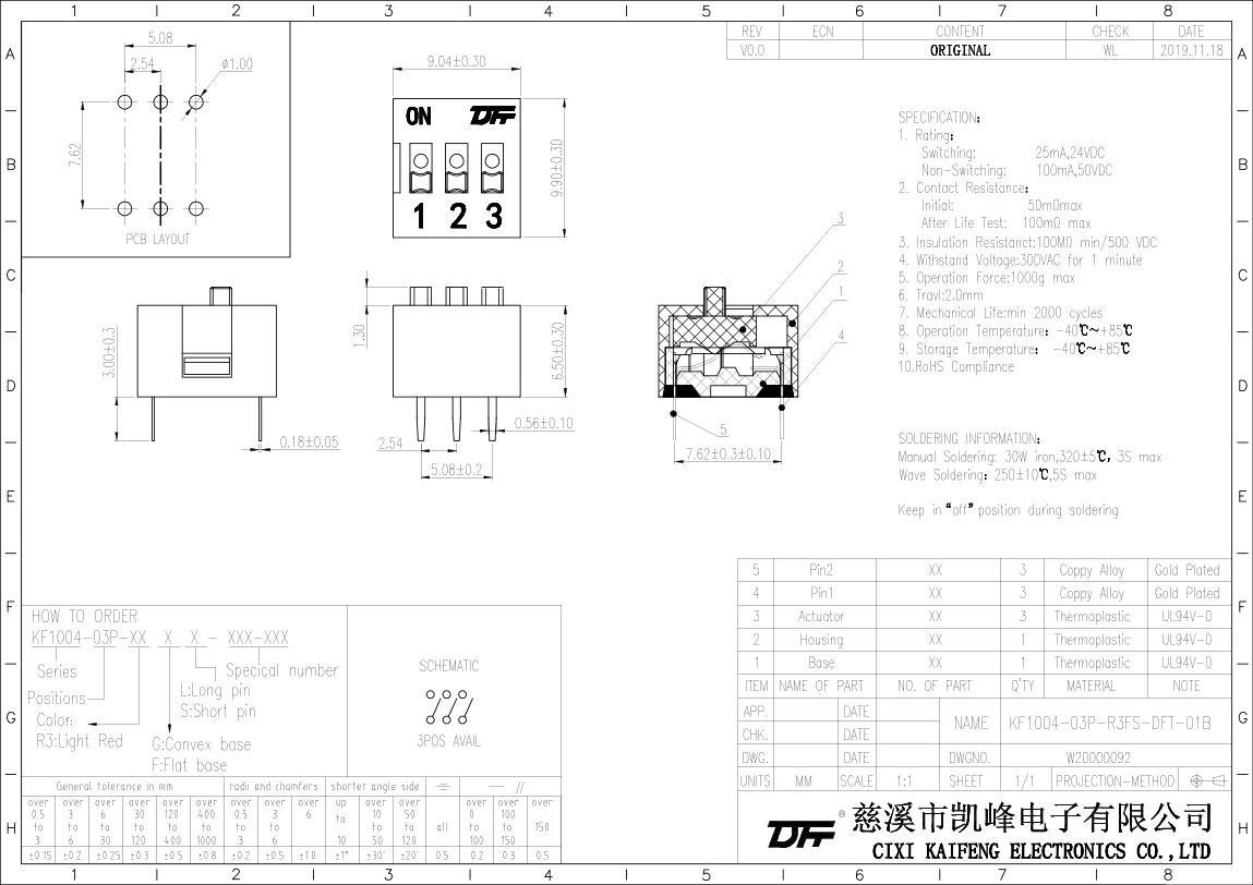 :UL94V-0 Thermoplaslic,WhiteTerminal:Phosphor Bronze,Gold plating ElectricalElectrical life:2000 operations per switch 24VDC,25mARated