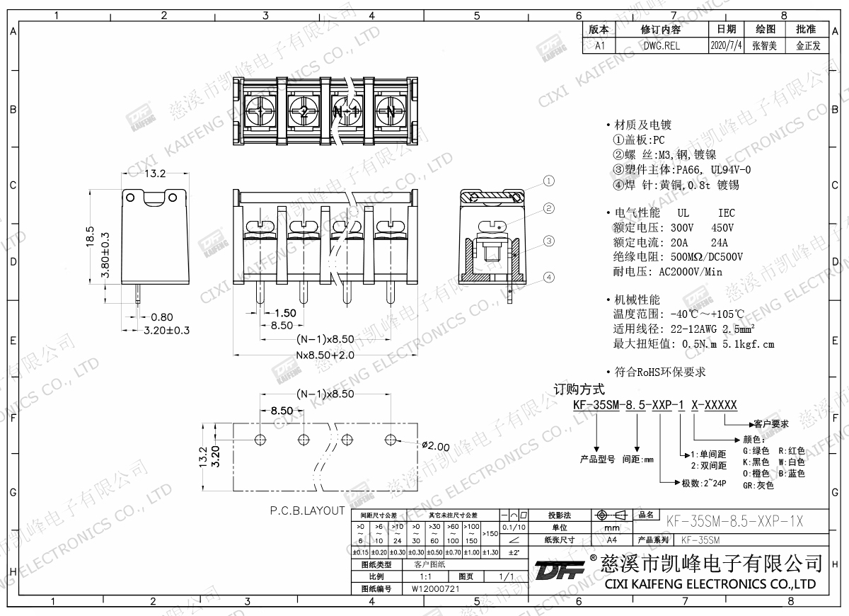 材質(zhì)電鍍:M3.0 鋼,鍍鎳端子:黃銅,0.8t 鍍鎳塑件: PA66,UL94V-0電氣性能ULIEC額定電壓300V 450V 額定電流20A24A絕緣電阻500MΩ/DC500V耐電壓AC2000V/1min使用線(xiàn)徑22-12AWG 2.5mm2機(jī)械性能溫度范圍-40℃~+105℃ 扭矩0.5N.m 4.4Lb.in