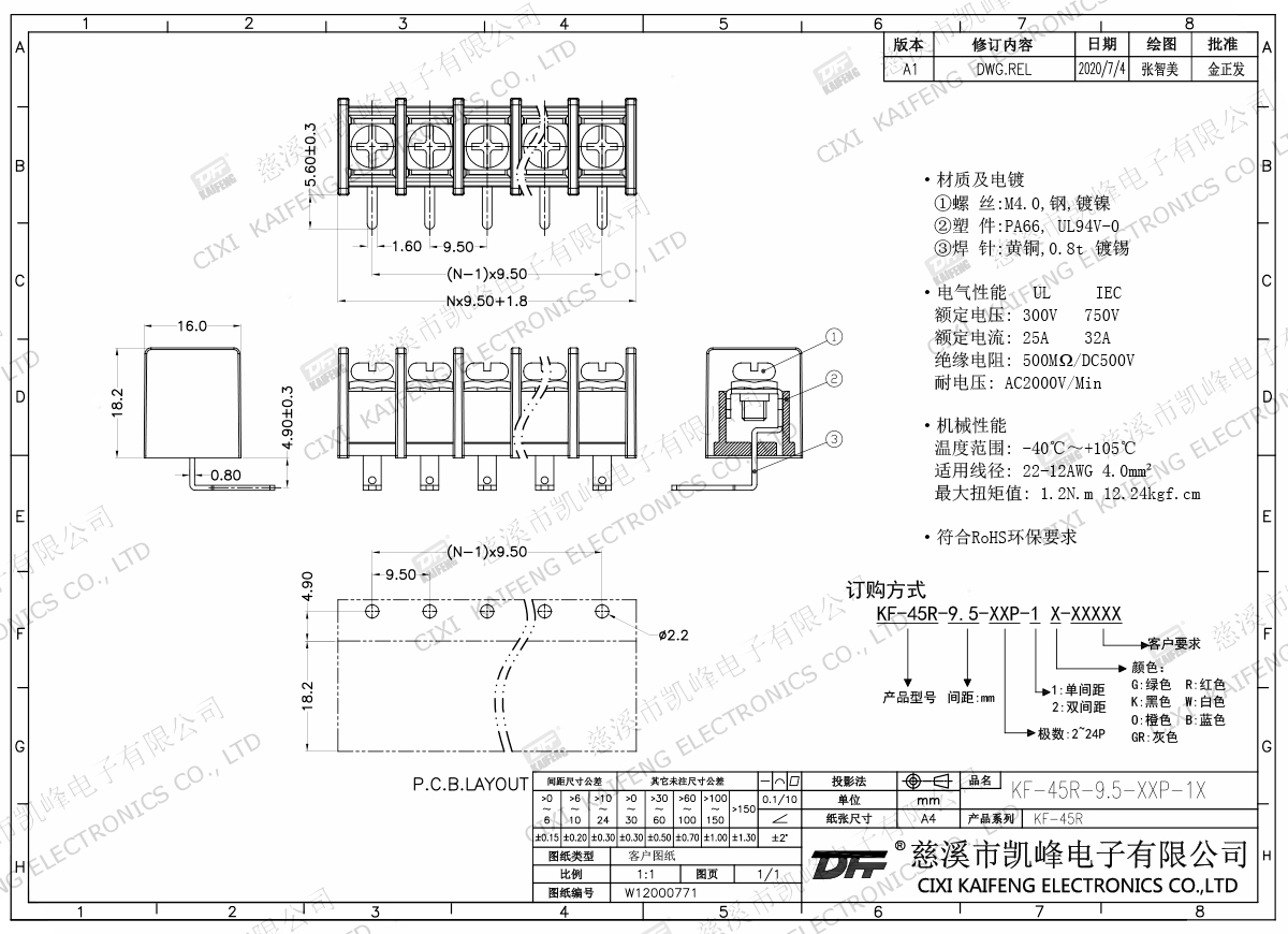柵欄式接線端子 材質(zhì)電鍍:M4.0 鋼,鍍鎳端子:黃銅,0.8t 鍍鎳塑件: PA66,UL94V-0電氣性能ULIEC額定電壓300V 750V 額定電流25A32A絕緣電阻500MΩ/DC500V耐電壓AC2000V/1min使用線徑22-12AWG 4.0mm2機(jī)械性能溫度范圍-40℃~+105℃ 扭矩1.2N.m 10.53Lb.in