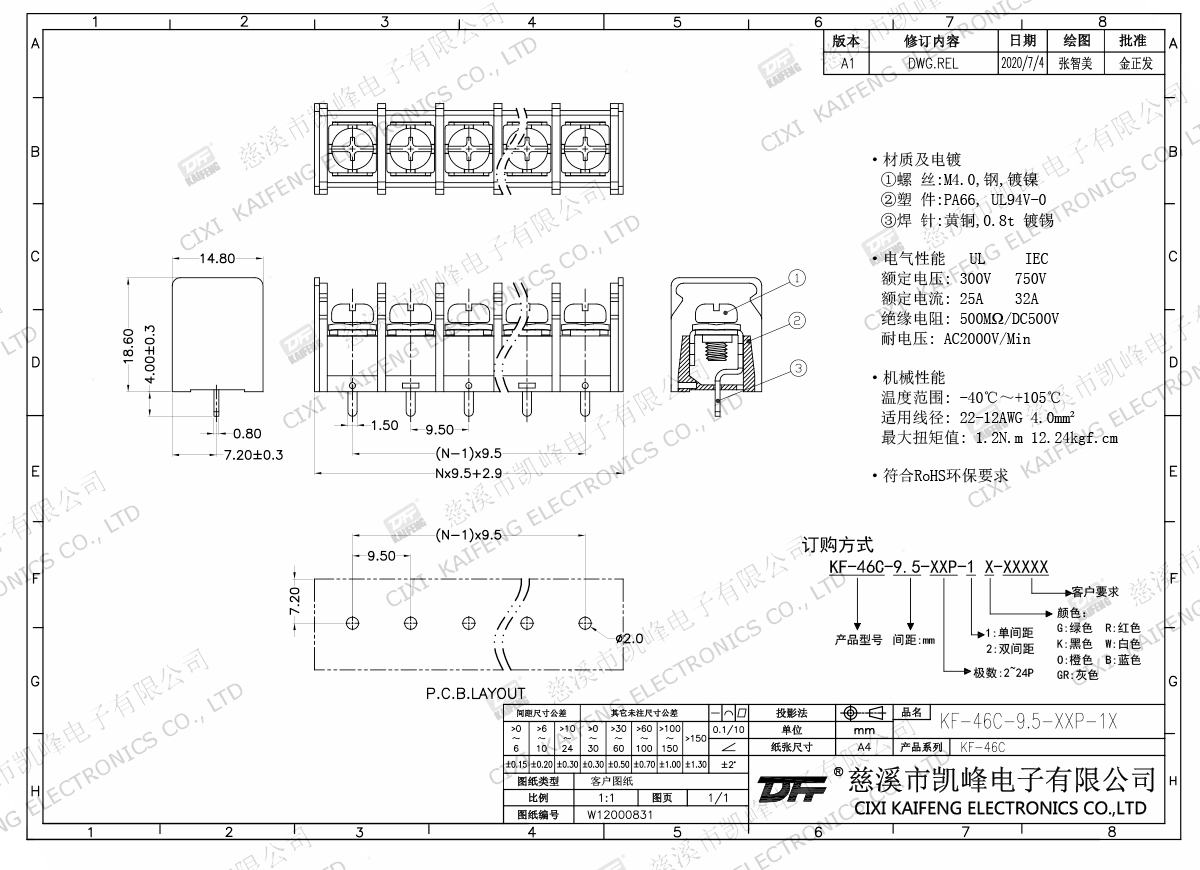 柵欄式接線端子 材質(zhì)電鍍:M4.0鋼,鍍鎳端子:黃銅,0.8t鍍鎳塑件:PA66,UL94V-0電氣性能ULIEC額定電壓300V750V額定電流25A32A絕緣電阻500MΩ/DC500V耐電壓AC2000V/1min使用線徑22-12AWG4.0mm2機械性能溫度范圍-40℃~+105℃扭矩1.2N.m10.53Lb.in
