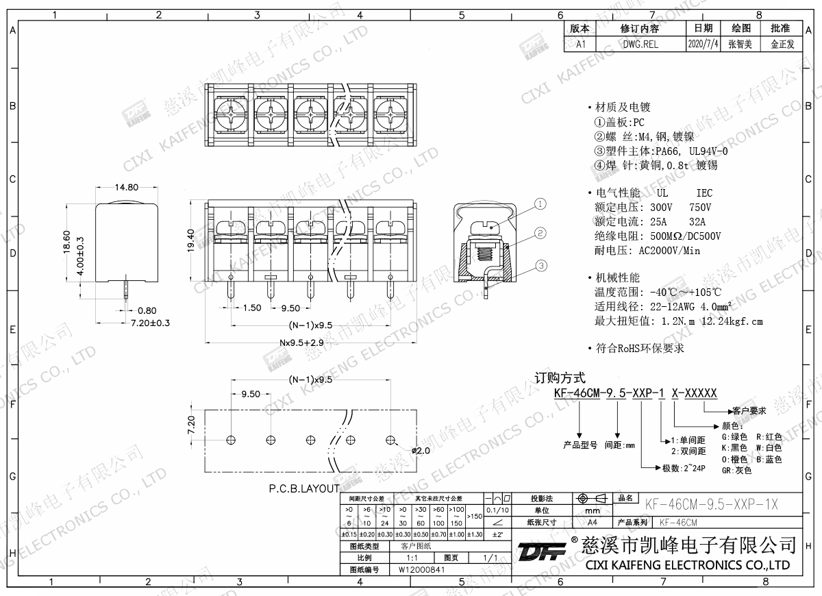 柵欄式接線端子 材質(zhì)電鍍:M4.0鋼,鍍鎳端子:黃銅,0.8t鍍鎳塑件:PA66,UL94V-0電氣性能ULIEC額定電壓300V750V額定電流25A32A絕緣電阻500MΩ/DC500V耐電壓AC2000V/1min使用線徑22-12AWG4.0mm2機(jī)械性能溫度范圍-40℃~+105℃扭矩1.2N.m10.53Lb.in