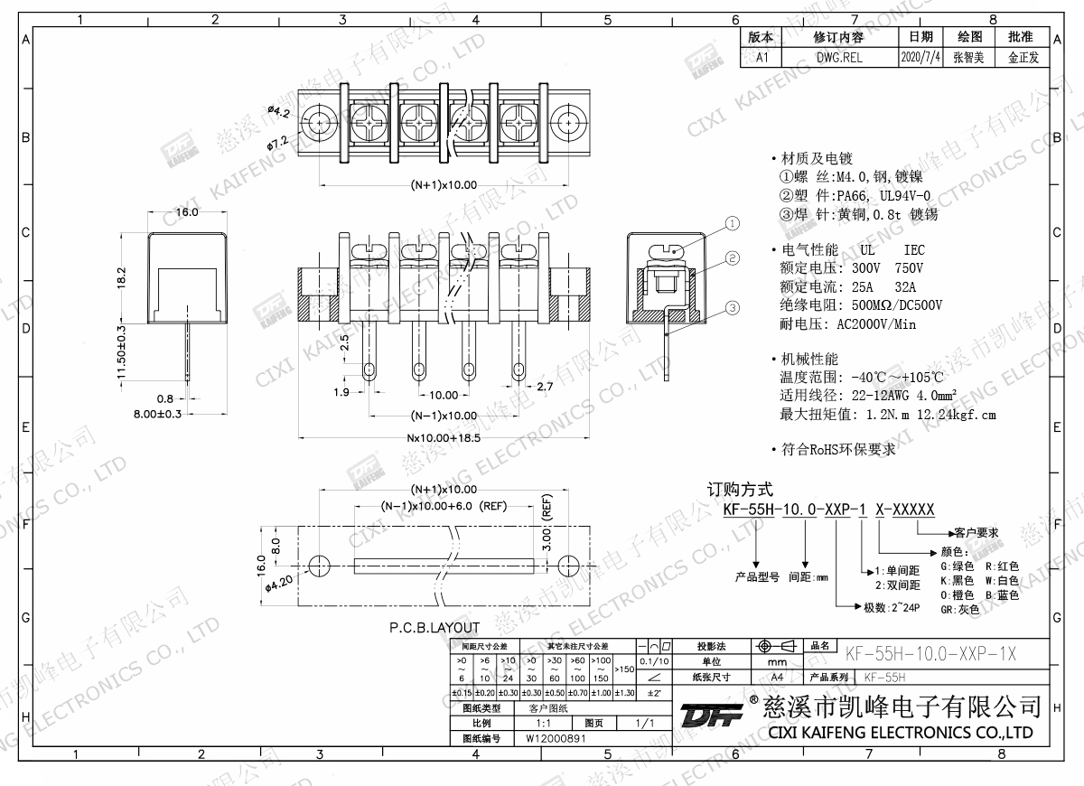 柵欄式接線端子 材質(zhì)電鍍:M4.0 鋼,鍍鎳端子:黃銅,0.8t 鍍鎳塑件: PA66,UL94V-0電氣性能ULIEC額定電壓300V 750V 額定電流25A32A絕緣電阻500MΩ/DC500V耐電壓AC2000V/1min使用線徑22-12AWG 4.0mm2機(jī)械性能溫度范圍-40℃~+105℃ 扭矩1.2N.m 10.53Lb.in