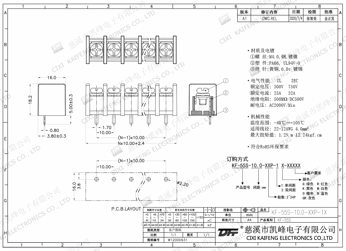 柵欄式接線端子 材質(zhì)電鍍:M4.0 鋼,鍍鎳端子:黃銅,0.8t 鍍鎳塑件: PA66,UL94V-0電氣性能ULIEC額定電壓300V 750V 額定電流25A32A絕緣電阻500MΩ/DC500V耐電壓AC2000V/1min使用線徑22-12AWG 4.0mm2機(jī)械性能溫度范圍-40℃~+105℃ 扭矩1.2N.m 10.53Lb.in
