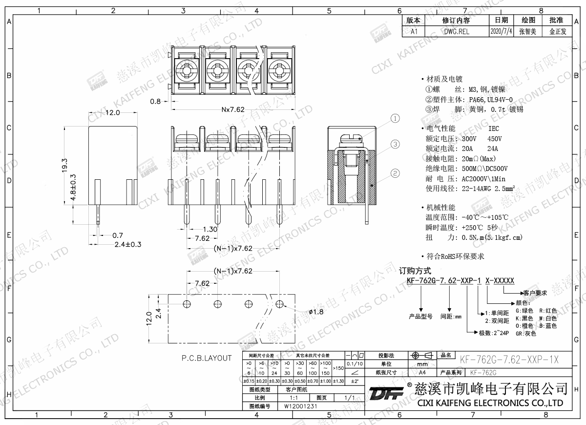 材質(zhì)電鍍:M3.0鋼,鍍鎳端子:黃銅,0.7t鍍鎳塑件:PA66,UL94V-0電氣性能ULIEC額定電壓300V450V額定電流20A24A絕緣電阻500MΩ/DC500V耐電壓AC2000V/1min使用線徑22-14AWG2.5mm2機(jī)械性能溫度范圍-40℃~+105℃扭矩0.5N.m5.1Lb.in