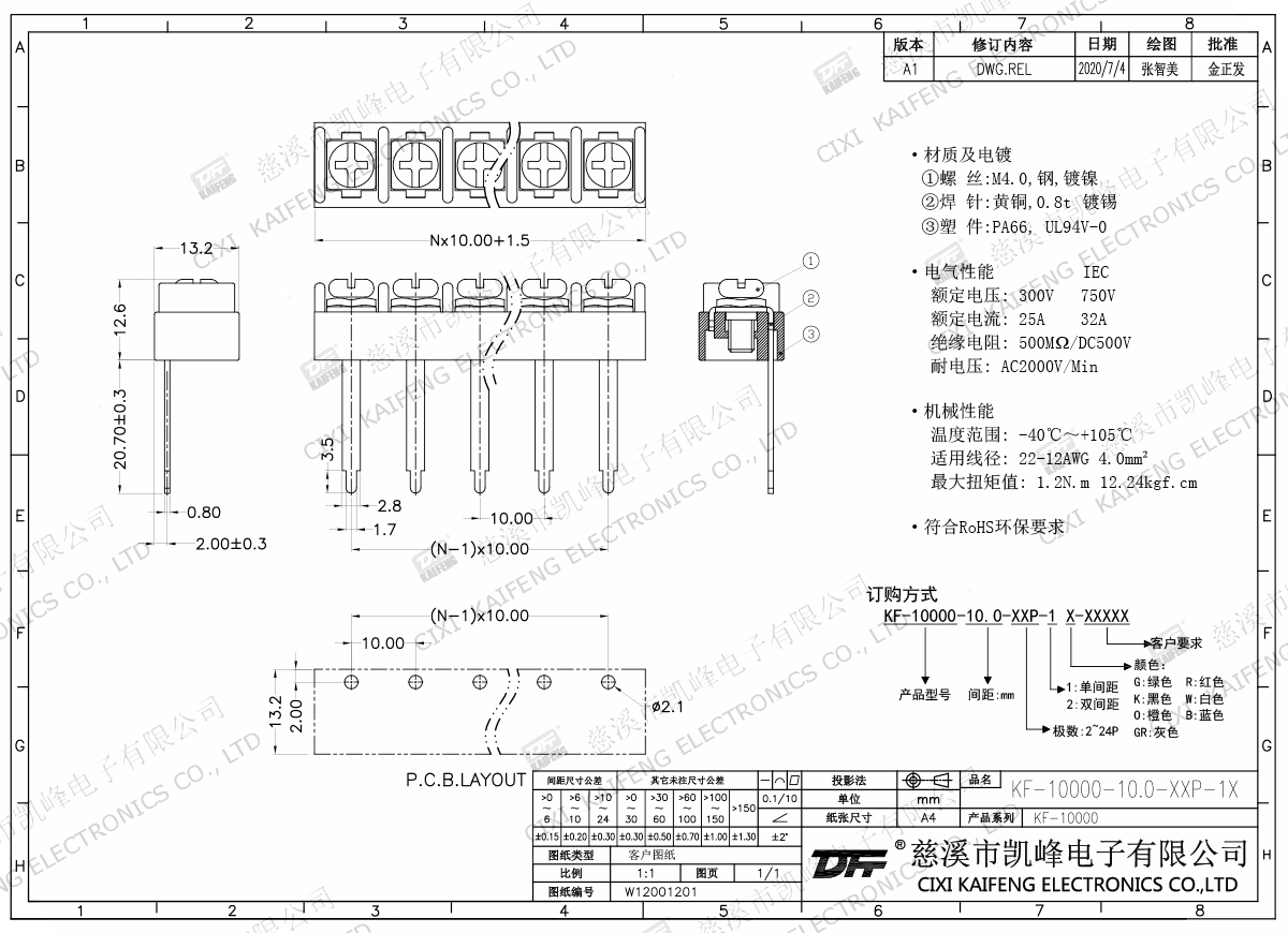 柵欄式接線端子 材質(zhì)電鍍:M4.0 鋼,鍍鎳端子:黃銅,0.8t 鍍鎳塑件: PA66,UL94V-0電氣性能ULIEC額定電壓300V 750V 額定電流25A32A絕緣電阻500MΩ/DC500V耐電壓AC2000V/1min使用線徑22-12AWG 4.0mm2機(jī)械性能溫度范圍-40℃~+105℃ 扭矩1.2N.m 10.53Lb.in