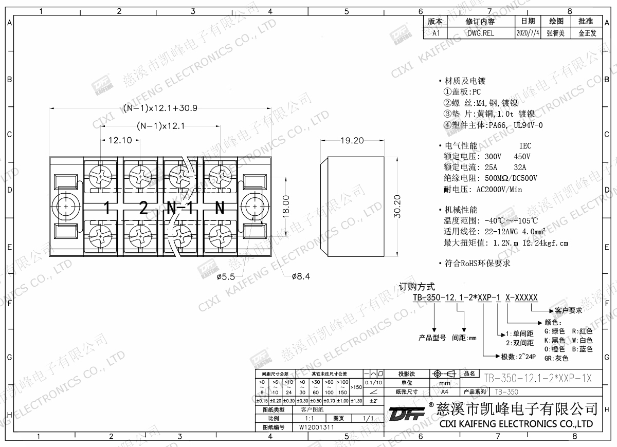 柵欄式接線端子 材質(zhì)電鍍:M4.0 鋼,鍍鎳端子:黃銅,1.0t 鍍鎳塑件: PC電氣性能ULIEC額定電壓300V 450V 額定電流25A32A絕緣電阻500MΩ/DC500V耐電壓AC2000V/1min使用線徑22-12AWG 0.5-4.0mm2機(jī)械性能溫度范圍-40℃~+105℃ 扭矩1.2N.m 10.53Lb.in