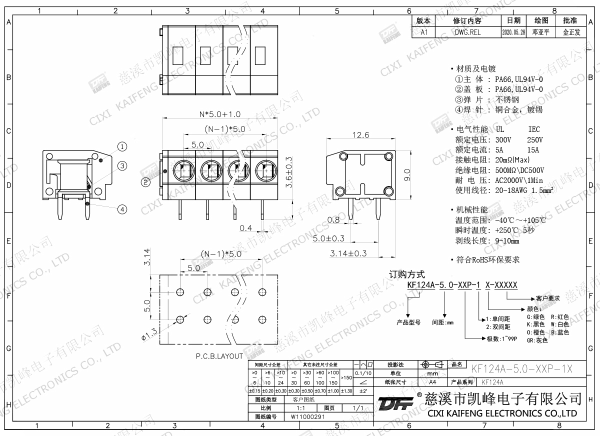 免螺絲式接線端子 材質(zhì)電鍍:①主體:PA66,UL94V-0②蓋板:PA66,UL94V-0③彈片:不銹鋼④焊針:黃銅,鍍錫電氣性能ULIEC額定電壓300V 250V 額定電流5A10A接觸電阻20mΩ絕緣電阻500MΩ/DC500V耐電壓AC2000V/1min使用線徑20-18AWG 1.5mm2機(jī)械性能溫度范圍-40℃~+105℃ 瞬時(shí)溫度+250℃,5sec扭矩-剝線長(zhǎng)度9-10mm
