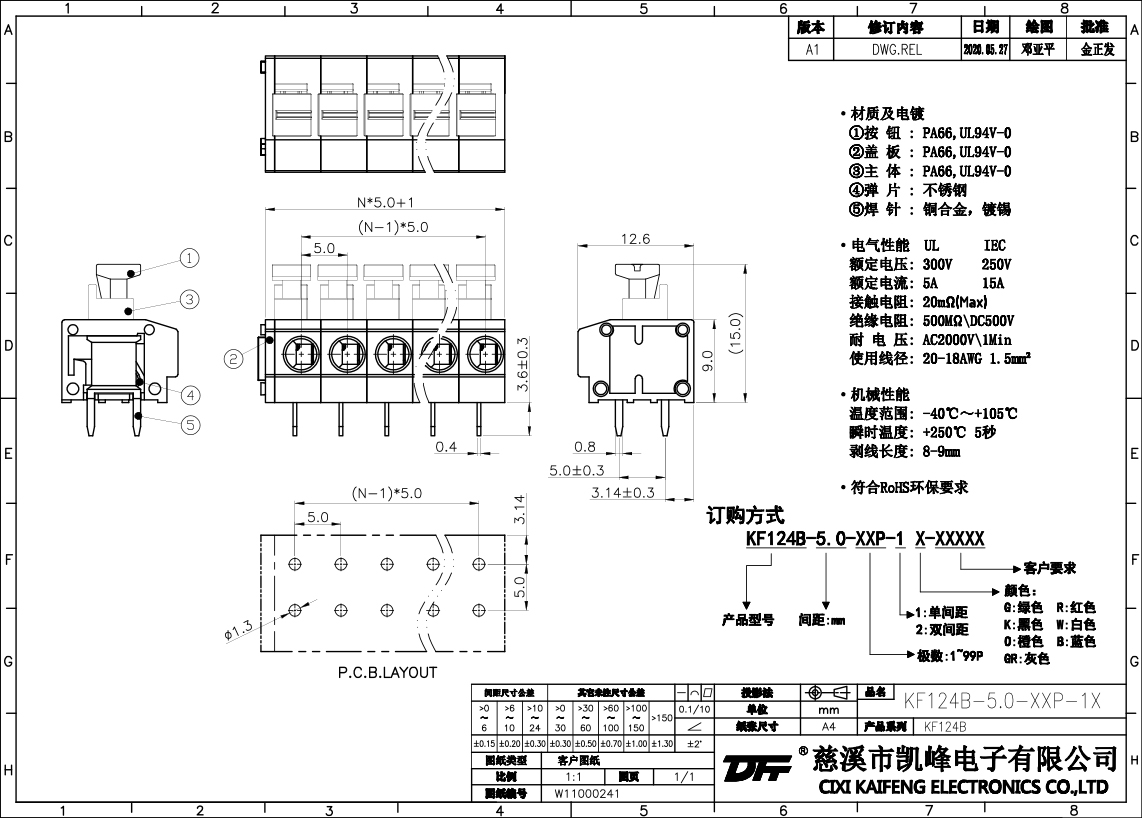 免螺絲式接線端子 材質(zhì)電鍍:①按鈕:PA66,UL94V-0②蓋板:PA66,UL94V-0③主體:PA66,UL94V-0④彈片:不銹鋼⑤焊針:黃銅,鍍錫電氣性能ULIEC額定電壓300V 250V 額定電流5A 10A接觸電阻20mΩ絕緣電阻500MΩ/DC500V耐電壓AC2000V/1min使用線徑20-18AWG 1.5mm2機械性能溫度范圍-40℃