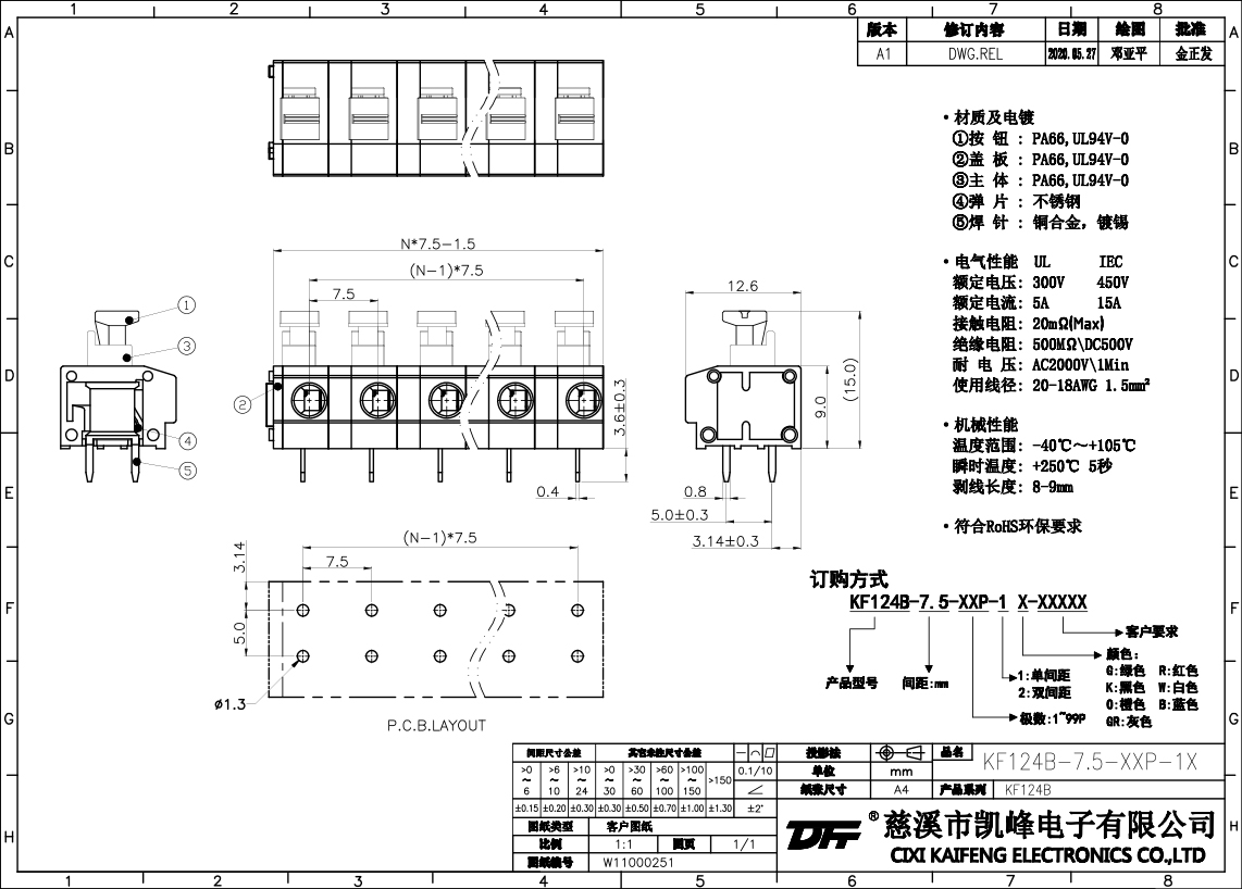 免螺絲式接線端子 材質電鍍:①按鈕:PA66,UL94V-0②蓋板:PA66,UL94V-0③主體:PA66,UL94V-0④彈片:不銹鋼⑤焊針:黃銅,鍍錫電氣性能ULIEC額定電壓300V 450V 額定電流5A 15A接觸電阻20mΩ絕緣電阻500MΩ/DC500V耐電壓AC2000V/1min使用線徑20-18AWG 1.5mm2機械性能溫度范圍-40℃