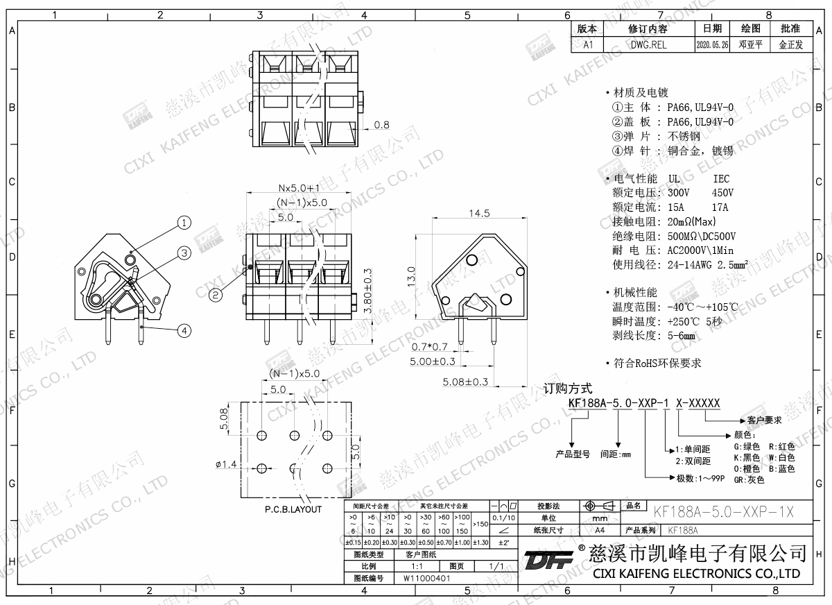 免螺絲式接線端子 材質(zhì)電鍍:材質(zhì)及電鍍①主體:PA66,UL94V-0②蓋板:PA66,UL94V-0③彈片:不銹鋼④焊針:黃銅,鍍錫電氣性能ULIEC額定電壓300V 450V額定電流15A17A接觸電阻20mΩ絕緣電阻500MΩ/DC500V耐電壓AC2000V/1min使用線徑24-14AWG 2.5mm2機(jī)械性能溫度范圍-40℃~+105℃ 瞬時溫度+250℃,5sec扭矩