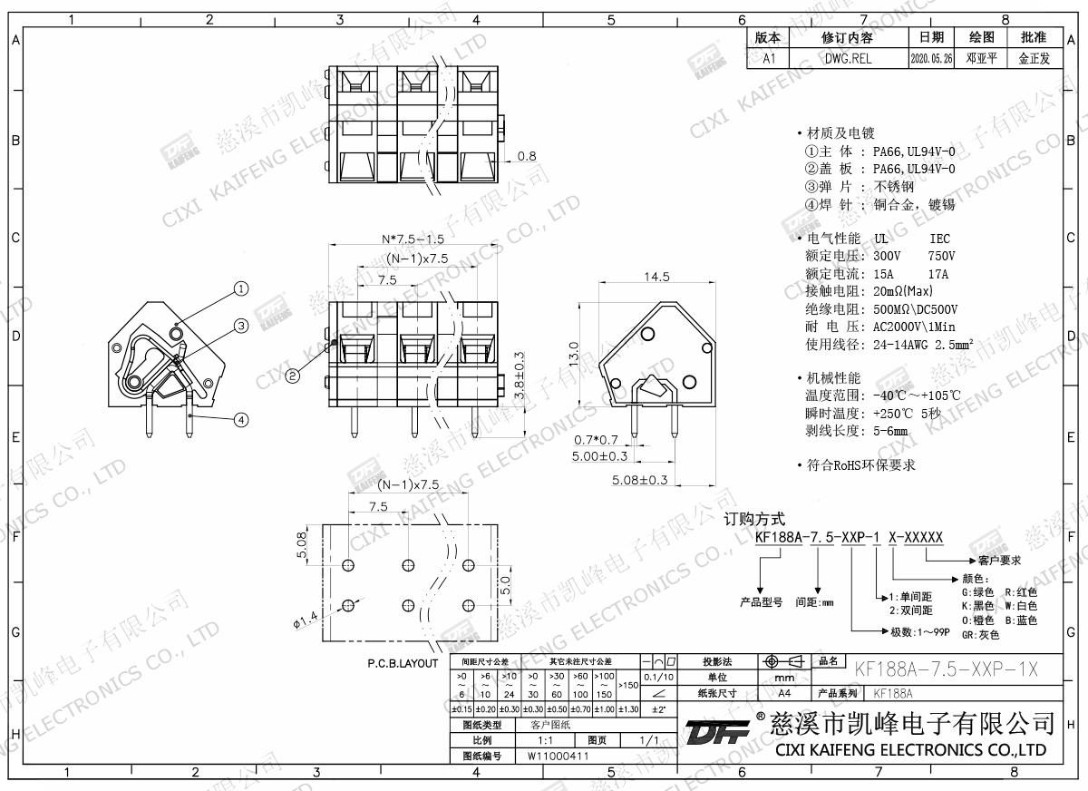 免螺絲式接線端子 材質(zhì)電鍍:材質(zhì)及電鍍①主體:PA66,UL94V-0②蓋板:PA66,UL94V-0③彈片:不銹鋼④焊針:黃銅,鍍錫電氣性能ULIEC額定電壓300V 1000V額定電流15A17A接觸電阻20mΩ絕緣電阻500MΩ/DC500V耐電壓AC2000V/1min使用線徑24-14AWG 2.5mm2機(jī)械性能溫度范圍-40℃~+105℃ 瞬時(shí)溫度+250℃,5sec扭矩