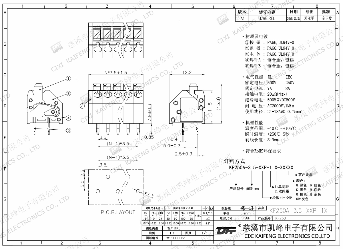 材質(zhì)電鍍:①按鈕:PA66,UL94V-0②蓋板:PA66,UL94V-0③主體:PA66,UL94V-0④焊針A:黃銅,鍍錫⑤焊針B:黃銅,鍍錫電氣性能ULIEC額定電壓300V 250V 額定電流7A6A接觸電阻20mΩ絕緣電阻500MΩ/DC500V耐電壓AC2000V/1min使用線徑24-18AWG 0.5mm2機(jī)械性能溫度范圍-40℃~+105℃ 瞬時(shí)溫