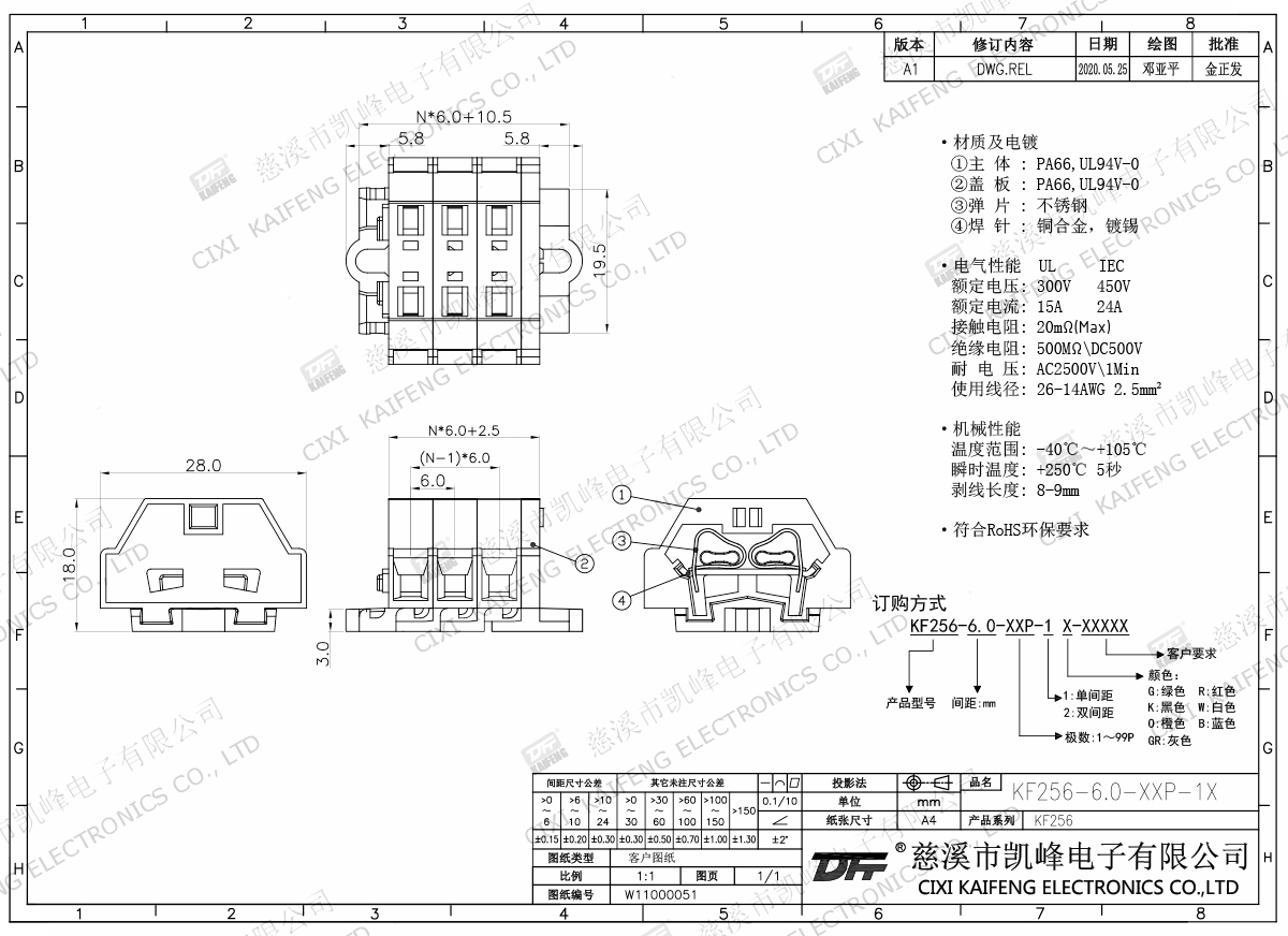免螺絲式接線端子 材質(zhì)電鍍:材質(zhì)及電鍍①蓋板:PA66,UL94V-0②主體:PA66,UL94V-0③彈片:不銹鋼④焊針:黃銅,鍍錫電氣性能ULIEC額定電壓300V 450V 額定電流15A24A接觸電阻20mΩ絕緣電阻500MΩ/DC500V耐電壓AC2500V/1min使用線徑26-14AWG 2.5mm2機(jī)械性能溫度范圍-40℃~+105℃ 瞬時溫度+250℃,5sec扭矩-剝線長度