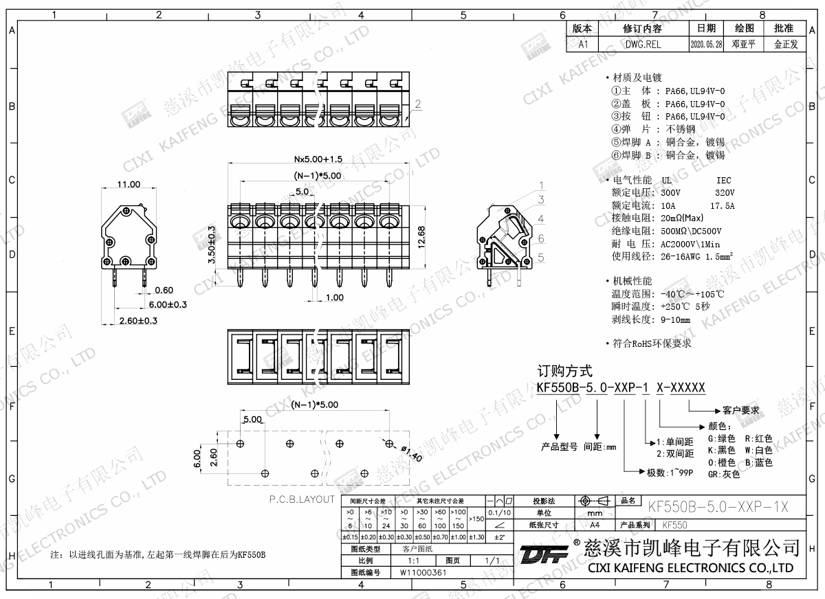 免螺絲式接線端子 材質電鍍:材質及電鍍①邊件:PA66,UL94V-0②中間件:PA66,UL94V-0③蓋板:PA66,UL94V-0④按鈕:PA66,UL94V-0⑤彈片:不銹鋼⑥長焊腳:紫銅,鍍錫⑦短焊腳:紫銅,鍍錫電氣性能ULIEC額定電壓300V 320V 額定電流10A17.5A接觸電阻20mΩ絕緣電阻500MΩ/DC500V耐電壓AC2000V/1min使用線徑26-16AWG 1.5mm2