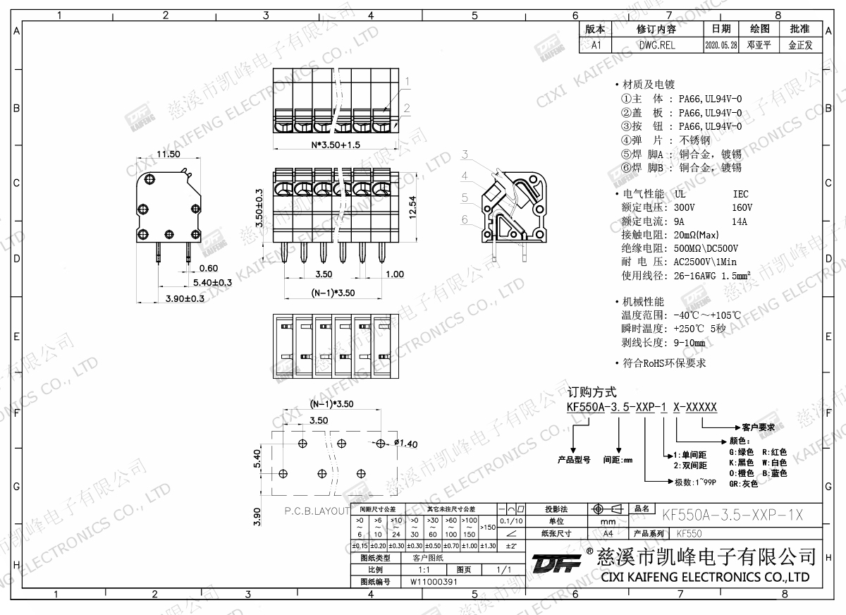 免螺絲式接線端子 材質(zhì)電鍍:材質(zhì)及電鍍①邊件:PA66,UL94V-0②中間件:PA66,UL94V-0③蓋板:PA66,UL94V-0④按鈕:PA66,UL94V-0⑤彈片:不銹鋼⑥長焊腳:紫銅,鍍錫⑦短焊腳:紫銅,鍍錫電氣性能ULIEC額定電壓300V 320V 額定電流10A17.5A接觸電阻20mΩ絕緣電阻500MΩ/DC500V耐電壓AC2000V/1min使用線徑26-16AWG 1.5mm2