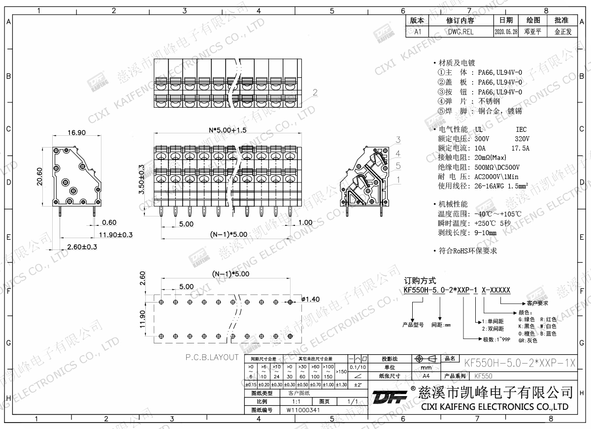 材質(zhì)電鍍:材質(zhì)電鍍:①邊件:PA66,UL94V-0②中間件:PA66,UL94V-0③蓋板:PA66,UL94V-0④按鈕:PA66,UL94V-0⑤彈片:不銹鋼⑥長(zhǎng)焊腳:紫銅,鍍錫⑦短焊腳:紫銅,鍍錫電氣性能ULIEC額定電壓300V 320V 額定電流10A17.5A接觸電阻20mΩ絕緣電阻500MΩ/DC500V耐電壓AC2000V/1min使用線徑26-16AWG 1.5mm2