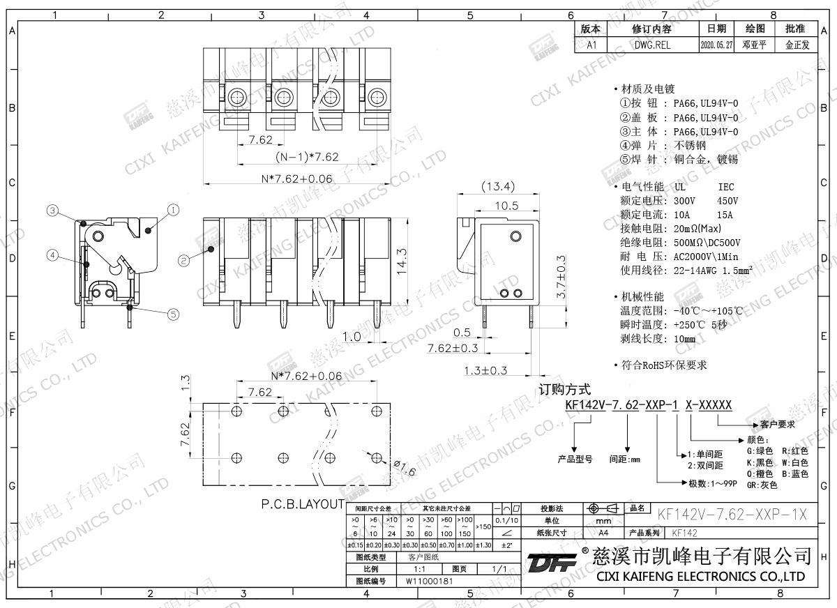 材質(zhì)電鍍:①按鈕:PA66,UL94V-0②蓋板:PA66,UL94V-0③主體:PA66,UL94V-0④彈片:不銹鋼⑤焊針:黃銅,鍍錫電氣性能ULIEC額定電壓300V 250V 額定電流10A15A接觸電阻20mΩ絕緣電阻500MΩ/DC500V耐電壓AC2000V/1min使用線徑22-14AWG 1.5mm2機(jī)械性能溫度范圍-40℃~+105℃ 瞬時溫度+250℃,5sec