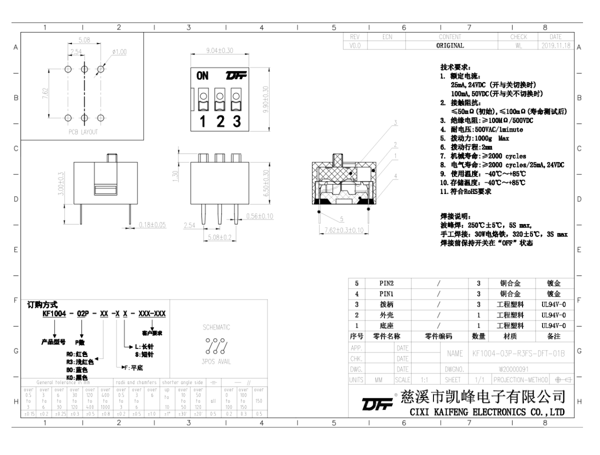 撥碼開(kāi)關(guān) 材質(zhì)電鍍:UL94V-0 工程塑料,黑色 上蓋:UL94V-0 工程塑料,紅色 藍(lán)色 黑色 推鈕:UL94V-0 工程塑料,白色端子:磷青銅鍍金 電氣性能電氣壽命:在電壓24VDC電流25mA之下測(cè)試,可來(lái)回?fù)軇?dòng)2000次開(kāi)關(guān)不常切換的額定電流:100mA,耐壓50VDC開(kāi)關(guān)經(jīng)常切換