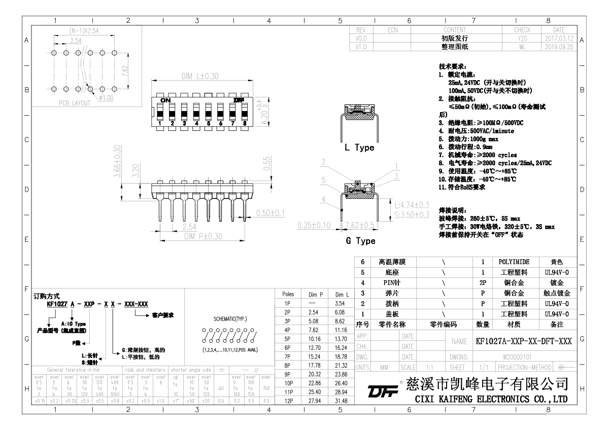 撥碼開關(guān) 材質(zhì)電鍍:UL94V-0 工程塑料,黑色 上蓋:UL94V-0 工程塑料,黑色 推鈕:UL94V-0 工程塑料,白色導(dǎo)體:磷青銅鍍金 性能說明額定電流開關(guān)不切換的額定電流:100mA,50VDC開關(guān)切換的額定電流:25mA,24VDC 接觸電阻初始值:50mΩ/Max測