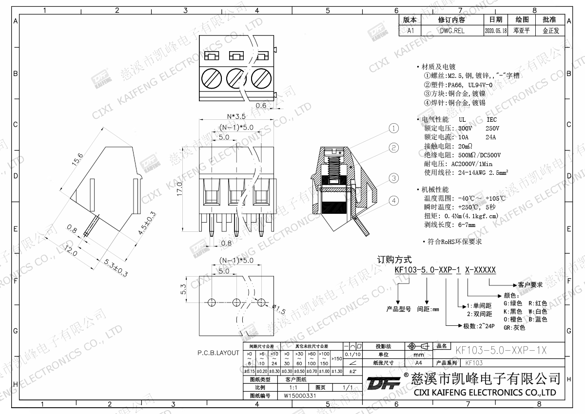 固定式式連接端子 材質(zhì)電鍍:①螺 絲 : M2.5 鋼,鍍鋅,"-"字槽 ②塑 件 : PA66, UL94V-0 ③方 盒 :黃銅,鍍鎳 ④焊 針 : 黃銅,