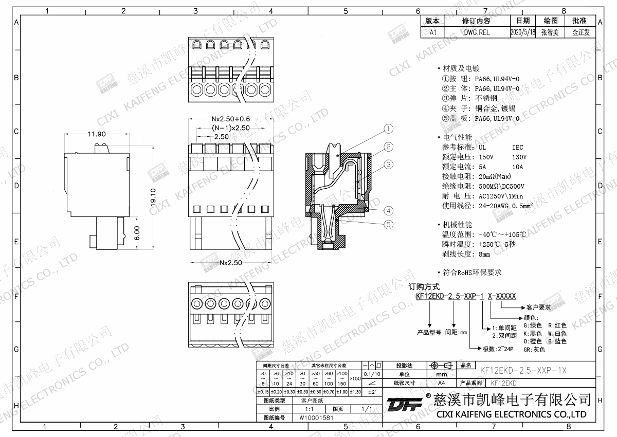 插拔式接線端子 固定式式連接端子 材質(zhì)電鍍:-觸點: 磷青銅焊針: -塑件: PA66,UL94V-0電氣性能ULIEC額定電壓150V 130V 額定電流5A10A接觸電阻20mΩ絕緣電阻500MΩ/DC500V耐電壓AC1250V/1min使用線徑24-20AWG 0.5mm2機械性能溫度范圍-40℃~+105℃ 瞬時溫度+250℃,5sec扭矩-剝線長度8