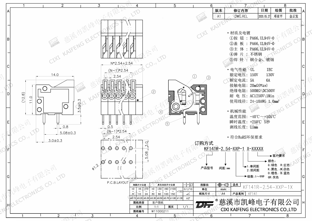 免螺絲式接線端子 材質(zhì)電鍍:①按鈕:PA66,UL94V-0②蓋板:PA66,UL94V-0③主體:PA66,UL94V-0④彈片:不銹鋼⑤焊針:黃銅,鍍錫電氣性能ULIEC額定電壓150V 130V 額定電流5A6A接觸電阻20mΩ絕緣電阻500MΩ/DC500V耐電壓AC1250V/1min使用線徑24-18AWG 1.0mm2機(jī)械性能溫度范圍-40℃~+105℃ 瞬時(shí)溫度+250℃,5sec