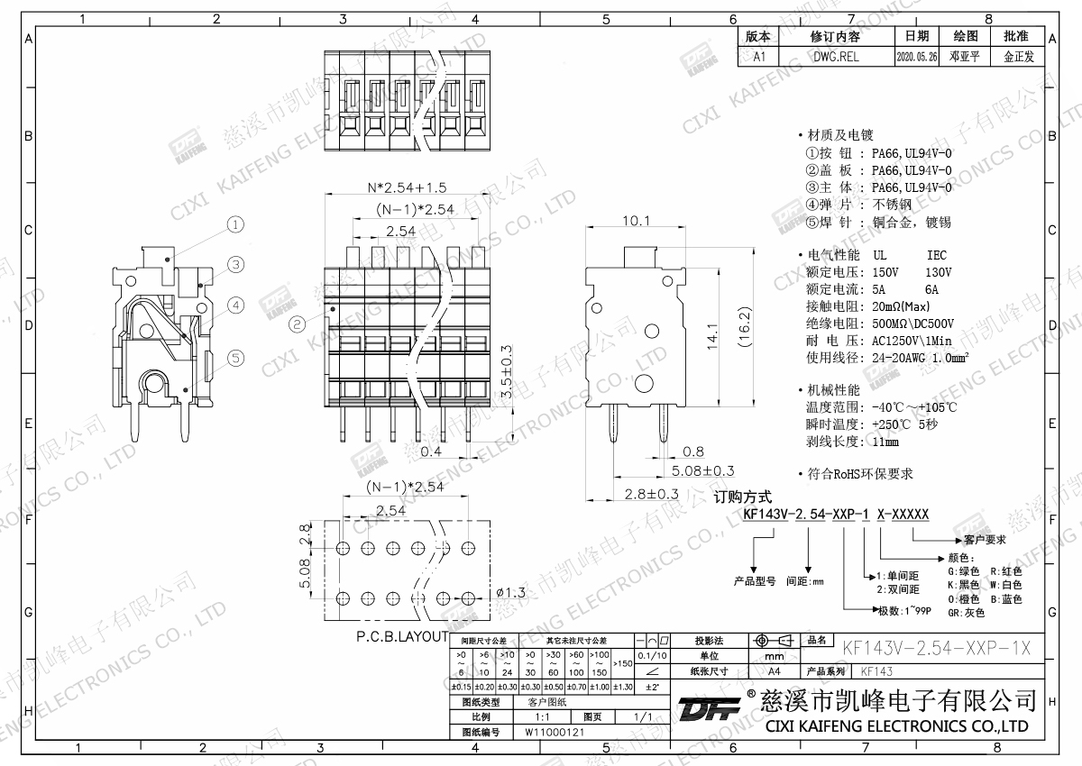免螺絲式接線端子 材質(zhì)電鍍:①按鈕:PA66,UL94V-0②蓋板:PA66,UL94V-0③主體:PA66,UL94V-0④彈片:不銹鋼⑤焊針:黃銅,鍍錫電氣性能ULIEC額定電壓150V 130V 額定電流5A6A接觸電阻20mΩ絕緣電阻500MΩ/DC500V耐電壓AC1250V/1min使用線徑24-20AWG 1.0mm2機械性能溫度范圍-40℃~+105℃ 瞬時溫度+250℃,5sec