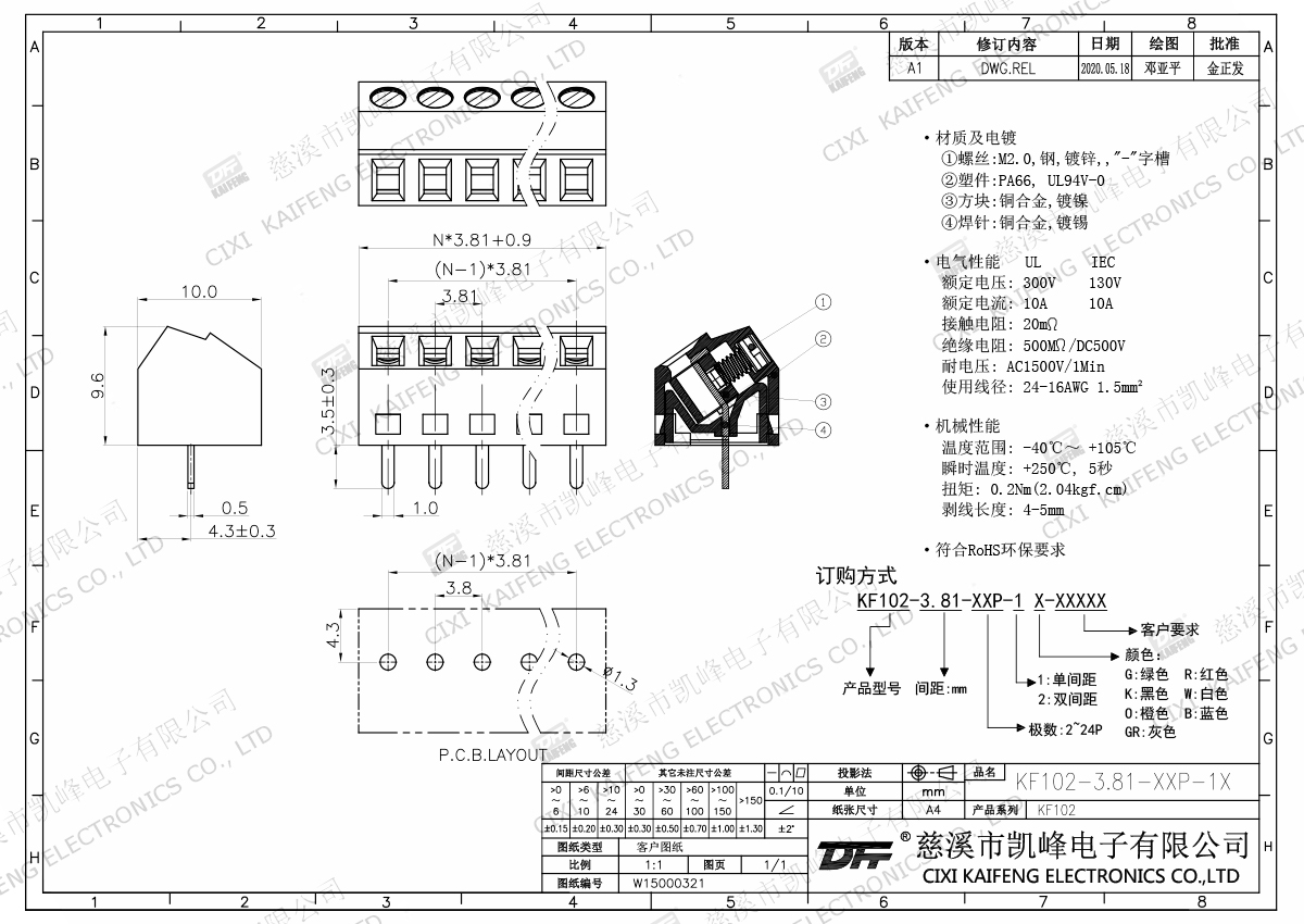 固定式式連接端子 材質(zhì)電鍍:①螺 絲 : M2.0 鋼,鍍鋅,"-"字槽 ②塑 件 : PA66, UL94V-0 ③彈 片 : 磷青銅鍍鎳或不銹鋼