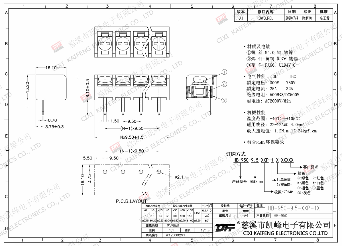 柵欄式接線端子 材質(zhì)電鍍:M4.0 鋼,鍍鎳端子:黃銅,0.8t 鍍鎳塑件: PA66,UL94V-0電氣性能ULIEC額定電壓300V 750V 額定電流25A32A絕緣電阻500MΩ/DC500V耐電壓AC2000V/1min使用線徑22-12AWG 4.0mm2機(jī)械性能溫度范圍-40℃~+105℃ 扭矩1.2N.m 10.53Lb.in