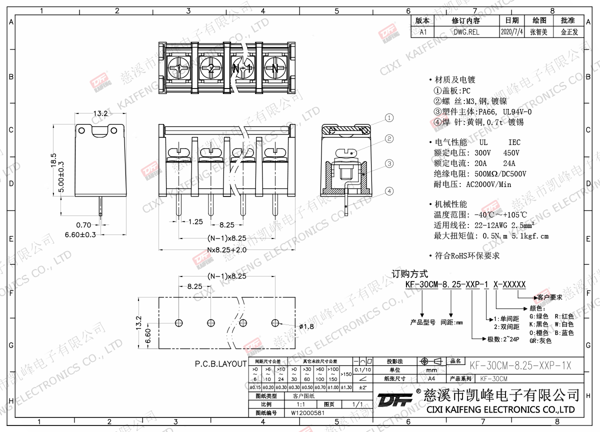 柵欄式接線端子 材質(zhì)電鍍:M3.0 鋼,鍍鎳端子:黃銅,0.7t 鍍鎳塑件: PA66,UL94V-0電氣性能ULIEC額定電壓300V 450V 額定電流20A24A絕緣電阻500MΩ/DC500V耐電壓AC2000V/1min使用線徑22-12AWG 2.5mm2機(jī)械性能溫度范圍-40℃~+105℃ 扭矩0.5N.m 4.4Lb.in