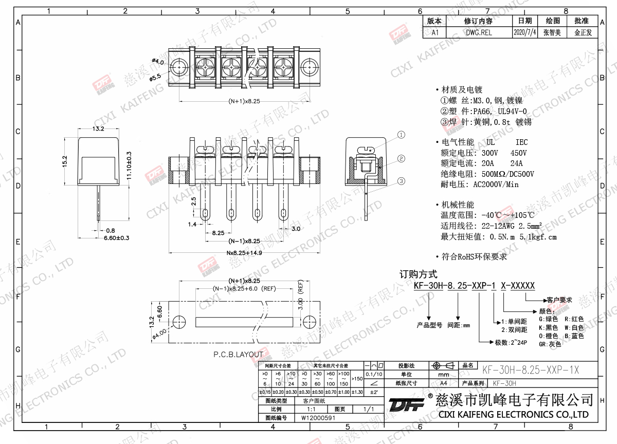 柵欄式接線端子 材質(zhì)電鍍:M3.0 鋼,鍍鎳端子:黃銅,0.8t 鍍鎳塑件: PA66,UL94V-0電氣性能ULIEC額定電壓300V 450V 額定電流20A24A絕緣電阻500MΩ/DC500V耐電壓AC2000V/1min使用線徑22-12AWG 2.5mm2機(jī)械性能溫度范圍-40℃~+105℃ 扭矩0.5N.m 4.4Lb.in