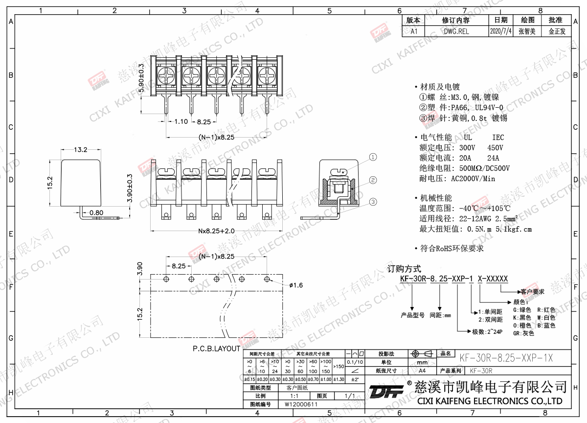 柵欄式接線端子 材質(zhì)電鍍:M3.0 鋼,鍍鎳端子:黃銅,0.8t 鍍鎳塑件: PA66,UL94V-0電氣性能ULIEC額定電壓300V 450V 額定電流20A24A絕緣電阻500MΩ/DC500V耐電壓AC2000V/1min使用線徑22-12AWG 2.5mm2機(jī)械性能溫度范圍-40℃~+105℃ 扭矩0.5N.m 4.4Lb.in