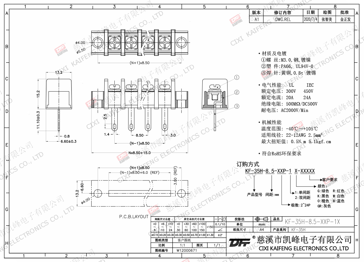 柵欄式接線端子 材質(zhì)電鍍:M3.0 鋼,鍍鎳端子:黃銅,0.8t 鍍鎳塑件: PA66,UL94V-0電氣性能ULIEC額定電壓300V 450V 額定電流20A24A絕緣電阻500MΩ/DC500V耐電壓AC2000V/1min使用線徑22-12AWG 2.5mm2機械性能溫度范圍-40℃~+105℃ 扭矩0.5N.m 4.4Lb.in