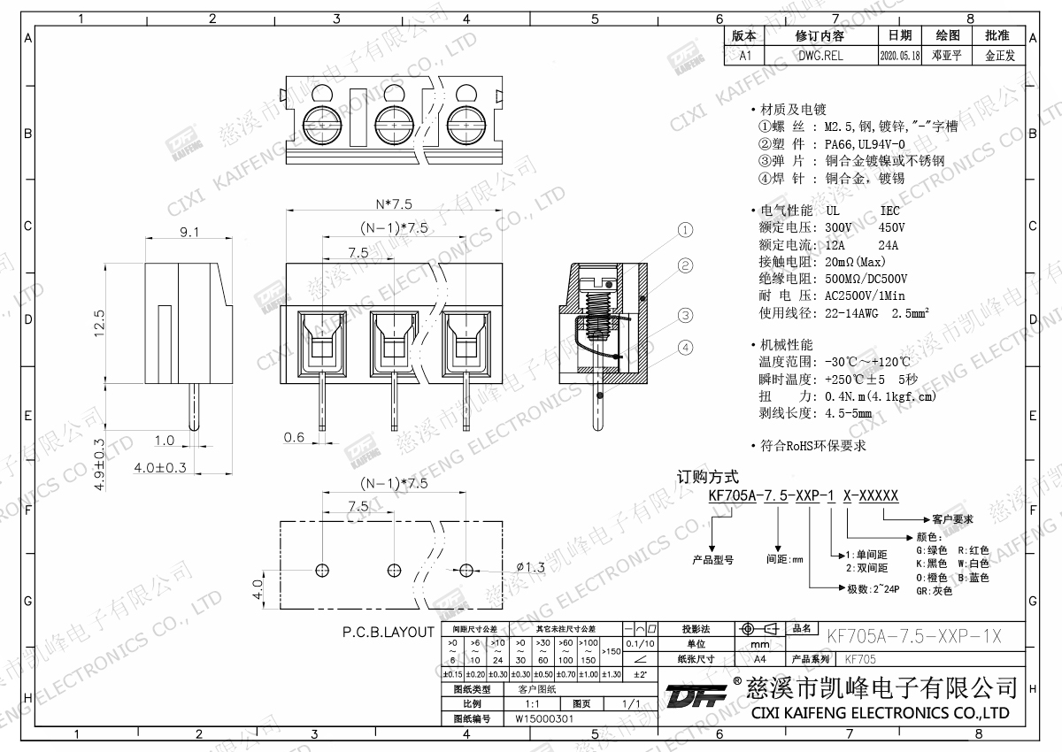 固定式式連接端子 螺絲:M2.5 鋼,鍍鋅,"-"字槽 丨 觸點(diǎn):- 丨 焊針:銅合金,鍍錫 丨 塑件:PA66, UL94V- 0 丨 電氣性能:ULIEC 丨 額定電壓:300V-450V 丨 額定電流:12A-24A 丨 接觸電阻:20m?(Max) 丨 絕緣電阻:500MΩ/DC500V 丨 耐電壓:AC2500V/1min 丨 使用線徑:22-14AWG 2.5mm2 丨 機(jī)械性能溫度范圍:-30℃~+120℃ 丨 瞬時(shí)溫度:+250℃,5sec