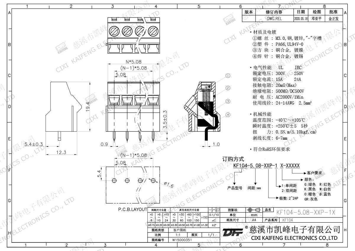 固定式式連接端子 材質(zhì)電鍍:①螺 絲 : M3.0 鋼,鍍鋅,"-"字槽 ②塑 件 : PA66, UL94V-0 ③方 盒 :黃銅,鍍鎳 ④焊 針 : 黃銅, 鍍錫 &nb