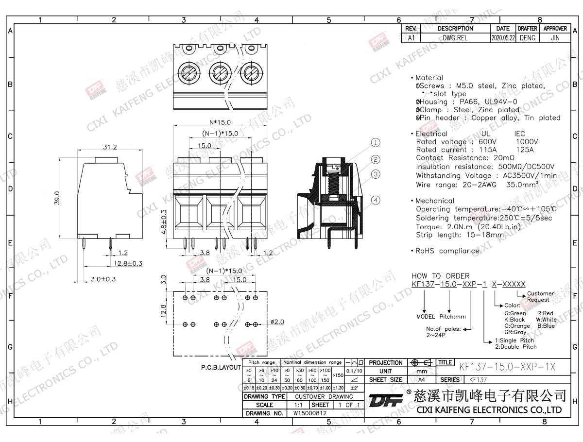 PCB Terminal Block MATERIAL:Screws:M5steel,Ni plated材料:Brass, Tin platedPin header:Brass, Tin platedHousing:PA66UL94V-0·ELECTRICALRated voltage:600VRated current:90AContact resistance:20m?Insulation resistance:5000M?\1000VWithstanding voltage :AC300V\1MinWire range:22-2AWG25mm2·MechanicalTemp.rang:-40℃∽+105℃Max.soldering:+250 ℃ / 5S torque:2Nm(17.54lb.in)Strip length:15-18mm